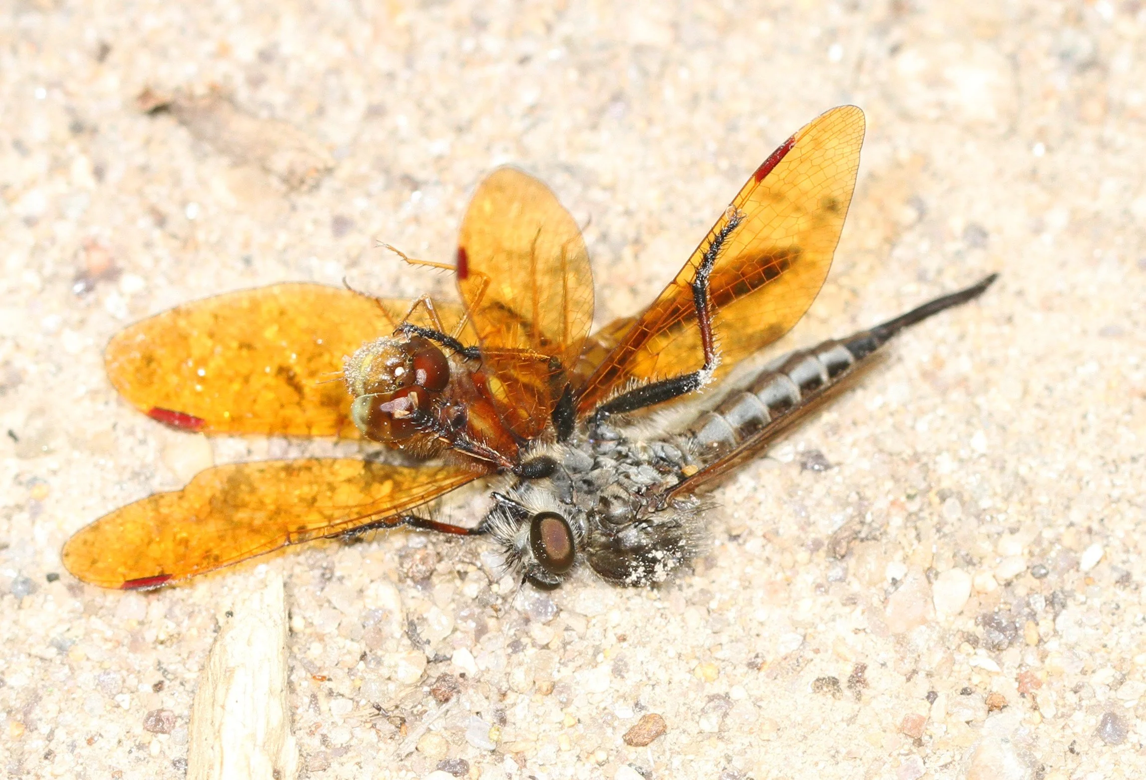 Robber Fly with Eastern Amberwing dragonfly, Judy Gallagher