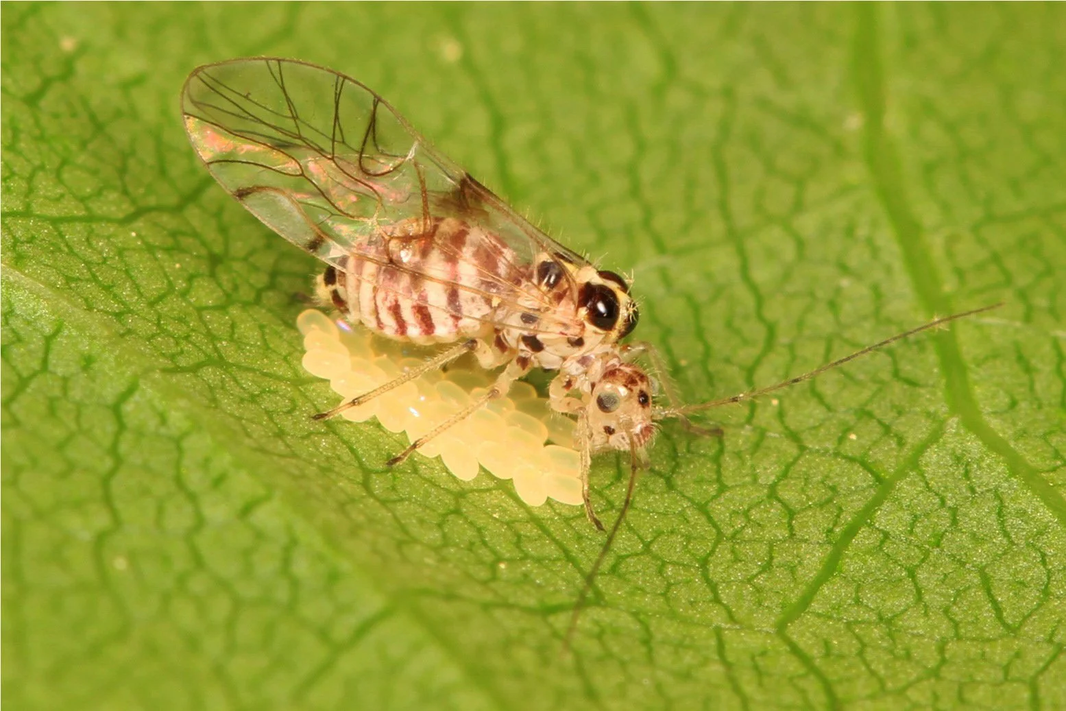 Shaggy Barklouse family - Teliapsocus conterminus female with eggs. Photo: Judy Gallagher