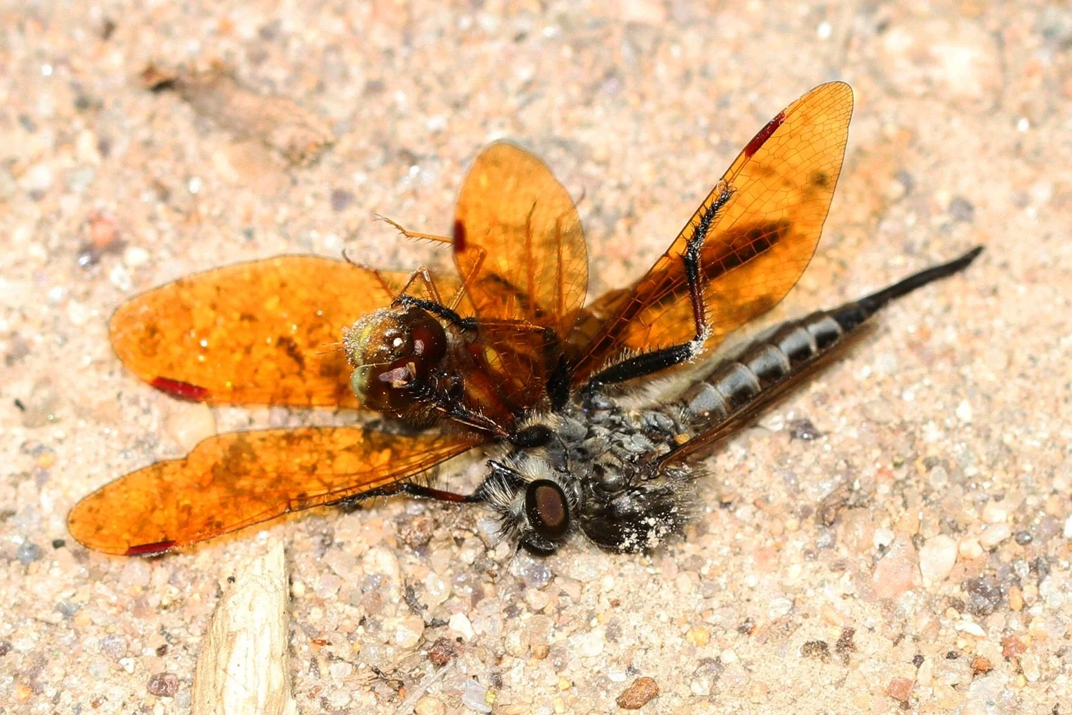 Most adult robber flies attack prey that is smaller than they are, but there are exceptions, like the robber fly that attacked the dragonfly in this picture. The heavier dragonfly caused the pair to crash on the ground. After the robber fly finished its meal, it flew off, presumably to find another meal.