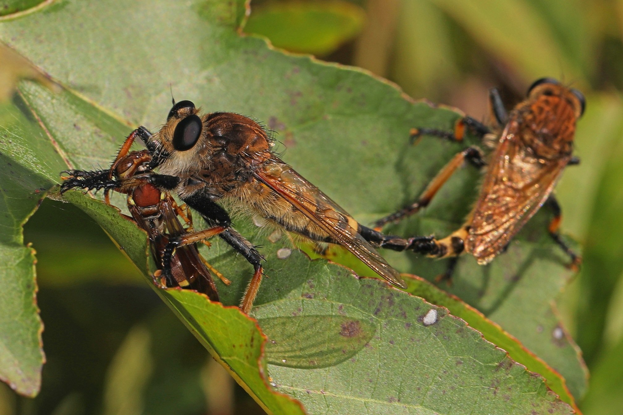 Robber flies mating, while one dines on wasp. Photo: Judy Gallagher