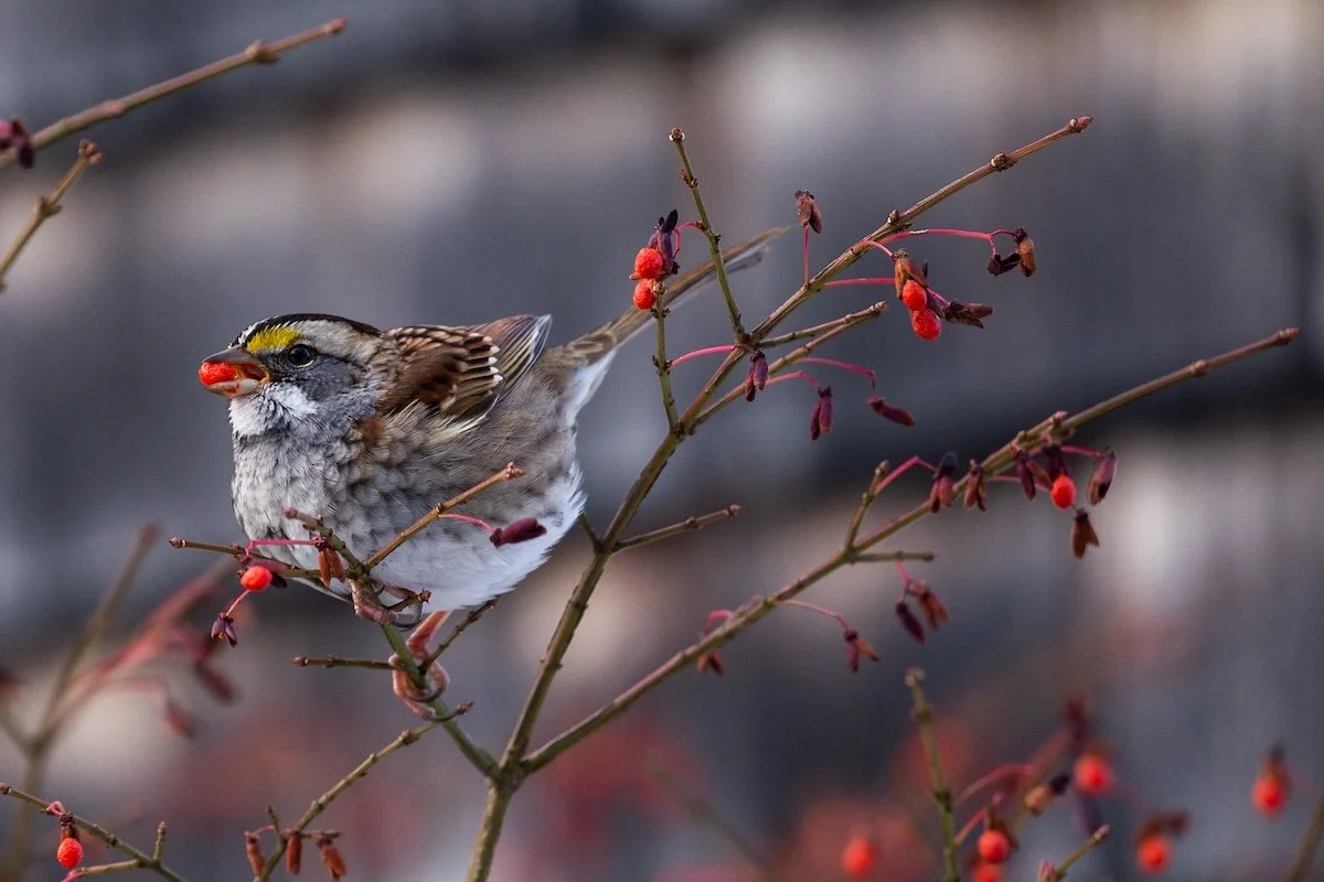 “Oh-sweet-Canada-Canada” or “Old-Sam-Peabody-Peabody” – no matter which phrase you associate with the song of the White-throated Sparrow, northern Virginia residents can expect to hear it throughout the coming months as these little birds sing of their return from breeding grounds in Canada. As winter encroaches, White-throated Sparrows fly south into the Midwest, Mid-Atlantic, and Southeast of the United States, with some also staying in coastal California. Although they are present year-round in the Northeast, that region’s summer residents head south and are replaced by northern populations.