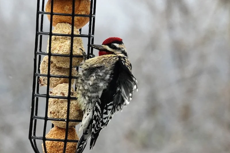 Suet cakes are a high-protein food that you can provide for woodpeckers, nuthatches, Pine Warblers, chickadees and Tufted Titmice.