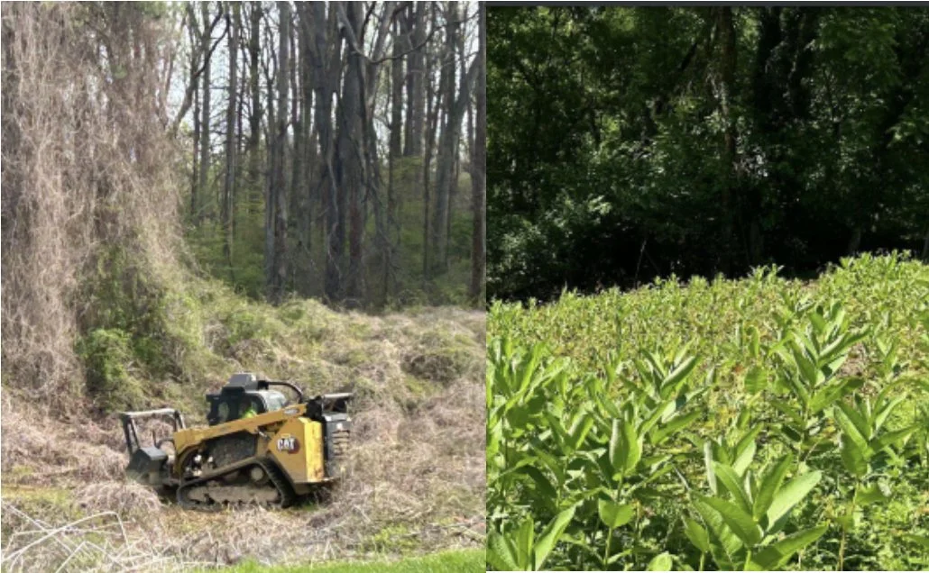 Clearing with a forestry grinder and growth of native milkweed, Photos courtesy of McLean Greens HOA