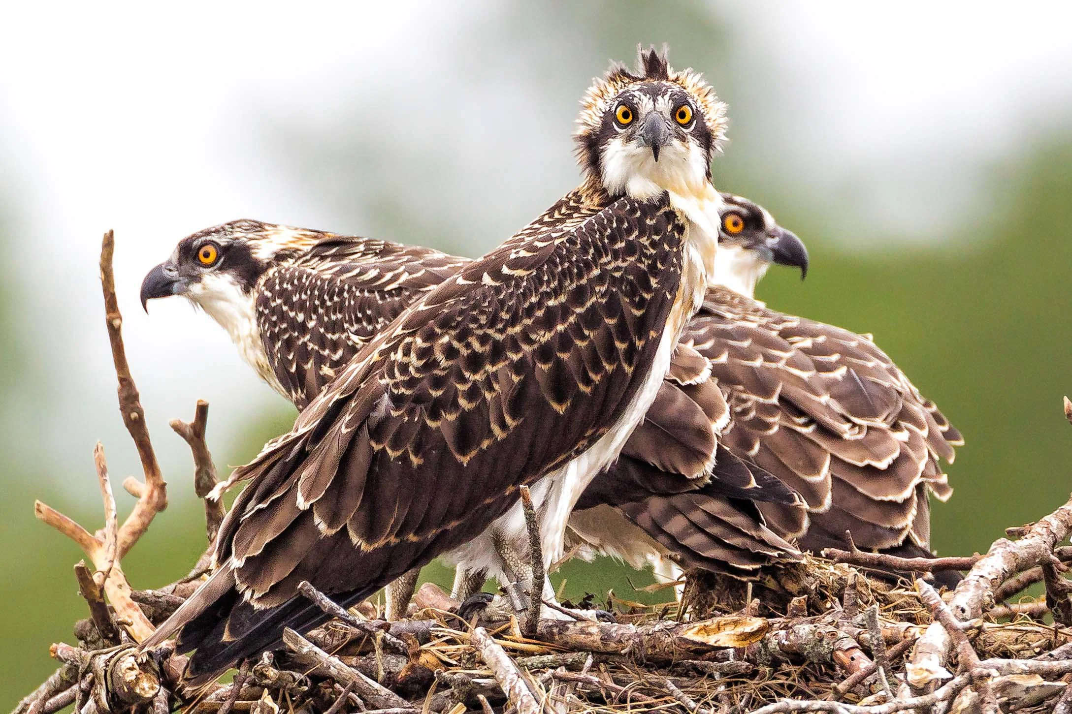 Osprey traditionally build their nests at the top of tall trees. However, they have become accustomed to and look for man-made platforms which suit them well. They seem to know that their primary predator, racoons, find these structures difficult to raid. However, the great horned owl and the eagle still have access. Ospreys exhibit nest fidelity, returning to the same nest site year after year, especially if they have been successful in raising chicks. First year Osprey often remain on wintering grounds for an extra year before heading north to breed in the area where they were born.