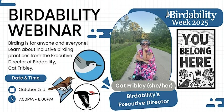 Join us and our local partner, DC Bird Alliance, as we work to promote Birdability’s mission through this free educational webinar on inclusive birding practices!