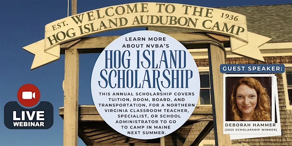 Each year, Northern Virginia Bird Alliance (NVBA) offers one classroom teacher, specialist or school administrator a scholarship to “Sharing Nature: An Educator’s Week” at Hog Island Audubon Camp, in coastal Maine. The scholarship covers tuition, room, board and transportation. Hog Island Audubon Camp has offered environmental education programs for adults, teens, families and conservation leaders since 1936.